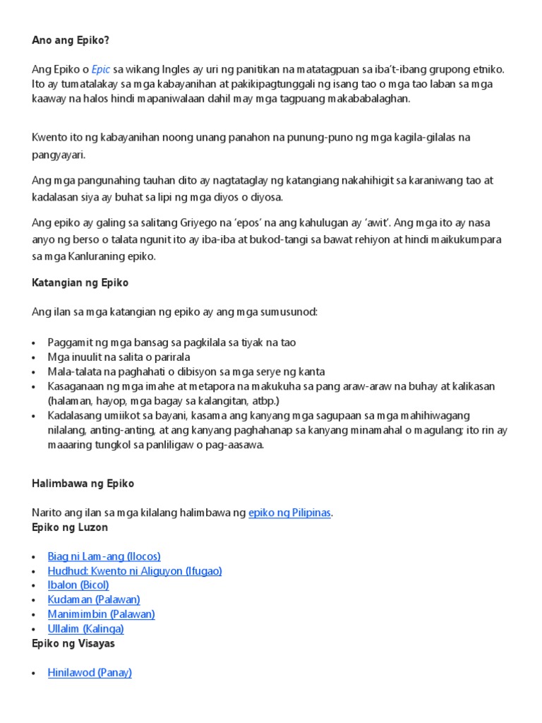 - inaawait bago dumating ang mga Kastila Otley Beyer - Pedro Bukaneg ang unuang sumulat. Feb 11 2020 KATANGIAN NG EPIKO Sa ating paksa ating alamin at tuklasin ang mga ibat ibang katangian ng epiko na isang panitikang patula. Oct 15 2020 BIAG NI LAM-ANG- Epiko ng mga IlocanoAng video na ito ay isang kagamitang panturo lamang.