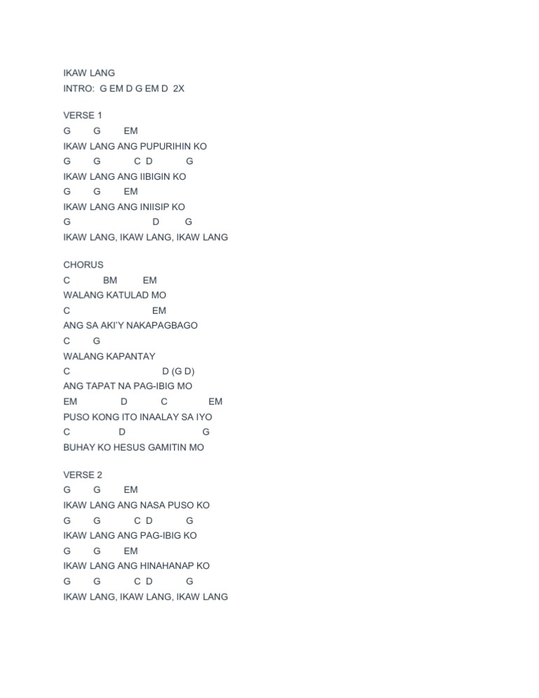 II Akoy napalingon Sa daan patungo sa Iyo Biglang naliwanagan Ikaw pala ang kailangansa buhay kong ito. E-E-E-E-E-E Cm-B Versex2 Esustained Ikaw lang ang pupurihin ko E Ikaw lang ang iibigin ko E Ikaw lang ang iniisip ko A B E Ikaw langIkaw lang Ikaw lang Chorus. Ikaw lamang ang pupurihin ko Ikaw lamang ang sasambahin ko Panginoong hesus ikaw ang buhay ko Pag-ibig moy tunay at totoo Sa aking buhay ikaw ang number one Sa aking puso youre the only one Problema may dumating Magtitiwala sayo Mga salita mo ay di nagbabago Pangamba koy nawawala sa piling mo Kapayapaan ang nadarama sa puso ko.